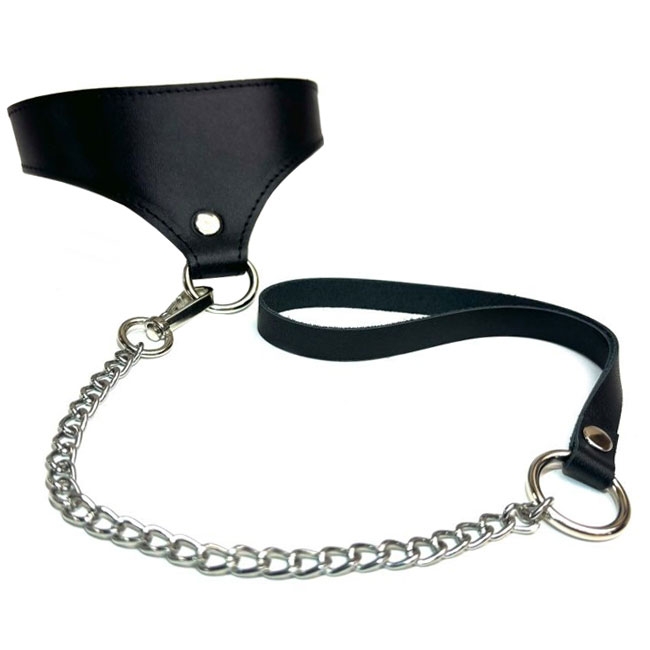 Стильный ошейник-воротничок из высококачественной натуральной кожи с металлической цепочкой-поводком на карабине.